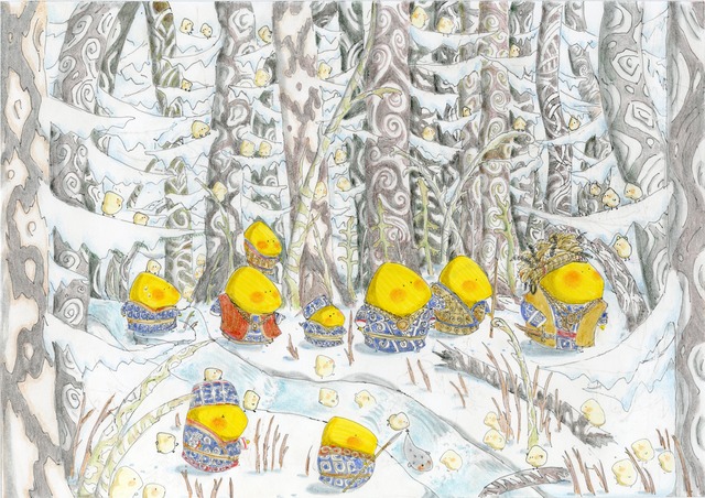 アイヌのファルたちは 小さなコロポックルたちに見守られ 大自然の中で自由に暮しています。 彼らは森と友達なので、 どんなことだってわかるのです。 しかしアイヌファルたち、ひとりの子ファルが川の中洲で 取り残されていることに気づいていません!! コロポックルちゃん、早く気づかせてあげて~! 2017.04 ボールペン、マーカー、色鉛筆 サイズ:W297×H210(mm)