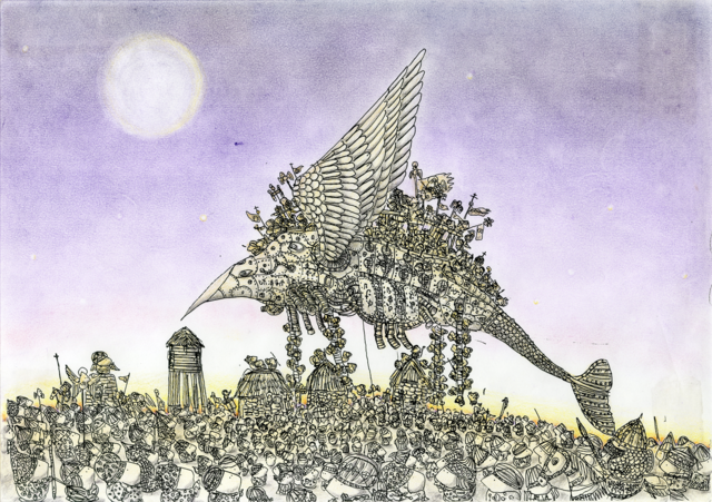 辺境のファルの村に誰も見た事もない飛行機が来た! 「あれはなんだ?」 「神の使いか?」 ファルたちは大挙して船に押し寄せます。 2016.05 ボールペン、マーカー、色鉛筆 サイズ:W297×H210(mm)