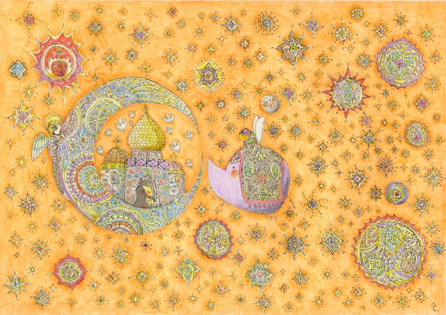 ~ダビッコラと宇宙へ(MOEのえほん)シリーズ~ 不思議な空飛ぶ生きものサナダ鳥に乗って、 ペットのダビッコラと一緒に、宇宙の見知らぬ星を大冒険しよう! 2018年ドローイングペン、色鉛筆、マーカー サイズ:W225×H225(mm)
